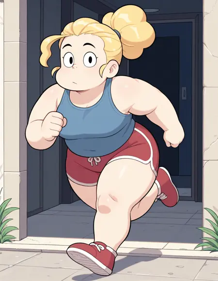 金发,马尾辫,头发向后梳,蓬松马尾,蓝色背心,红色短裤,红色鞋子