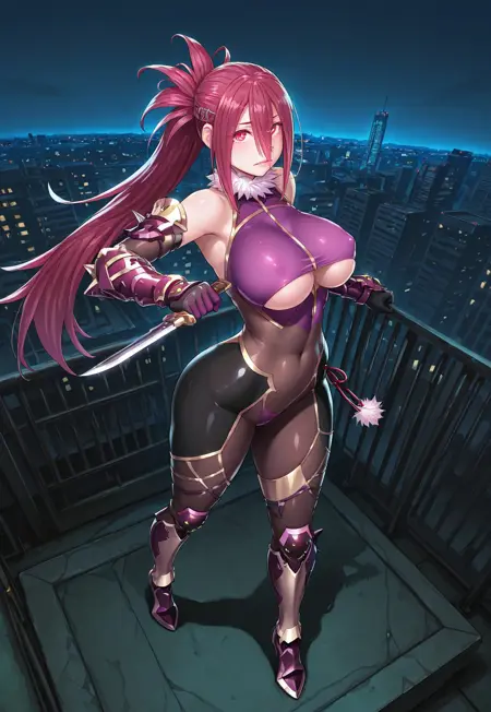 1番目の衣装: ニンジャ、タイマニンスーツ、ボディスーツ、ぴったりフィット、アンダーブラスト、肩出し、鎧、片腕用ガントレット