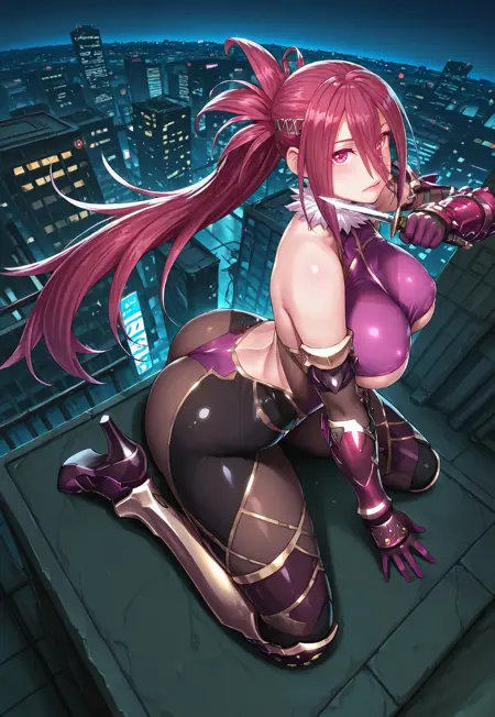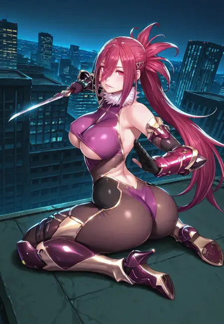 タグ: 柳六歩、赤髪、長い髪、眉間の髪、髪飾り、ポニーテール、赤い目、唇、くびれ、大きな胸、ツヤツヤ