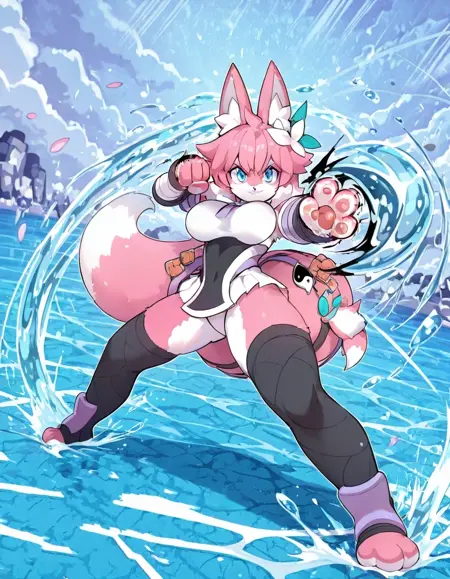 基础提示词:Lumentao,蓝眼睛,大胸,粉发,粉毛,白毛,白毛高光,动物爪子,爪足,爪手,双色毛发,动物耳朵,尾巴,黑白连衣裙,白裙,紫色领带,脱落袖子,黑色绷带长筒袜,臂部绷带,花朵发饰,尾巴装饰,宽臀,粗大腿,细腰,身体毛发,内裤,