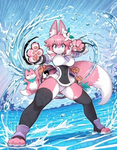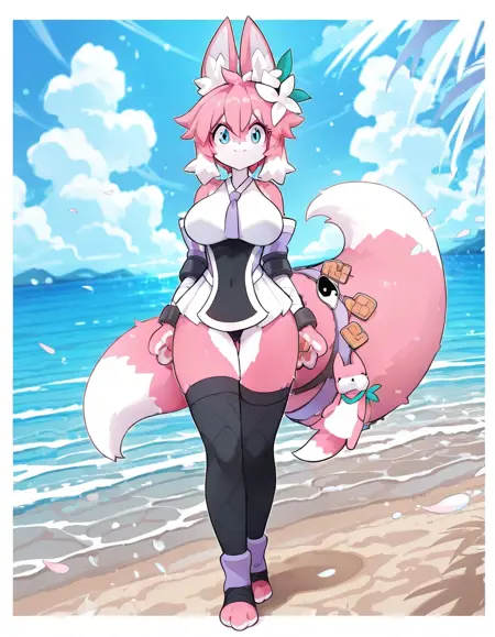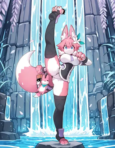 Basic prompts: Lumentao, blue eyes, large breasts, pink hair, pink fur, white fur, white fur highlights, animal paws, paw feet, paw hands, two toned fur, Animal ears, tail, black and white dress, white skirt, purple tie, detached sleeves, black bandage thighhighs, arm bandages, flower hair ornament, tail decorations, wide hips, thick thighs, thin waist, body fur, panties,