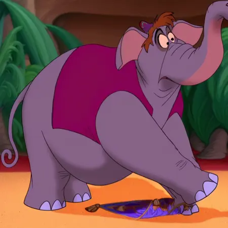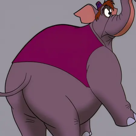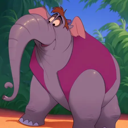 Prompt: Abu elephant, elephant, solo, brown hair, grey skin, black eyes, trunk, trunk nose, elephant trunk, elephant ears, monkey tail, purple vest, red and purple hat