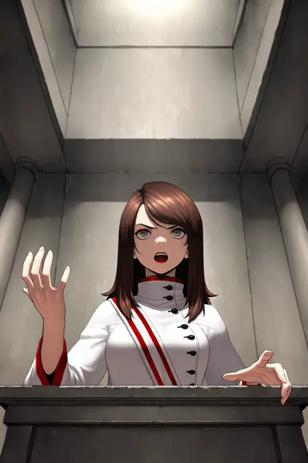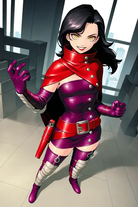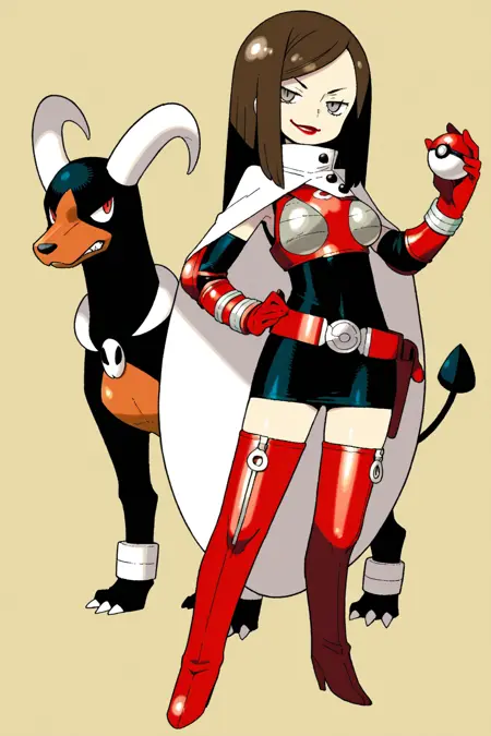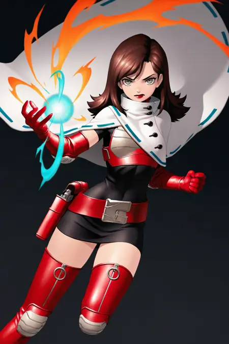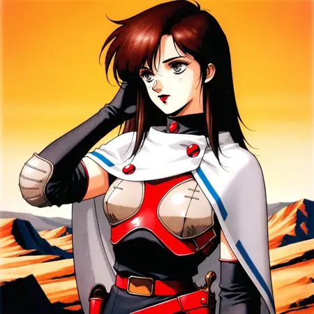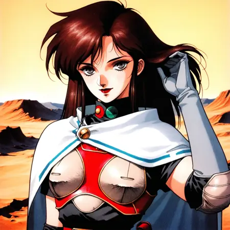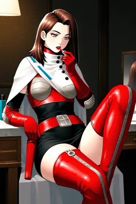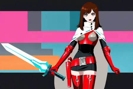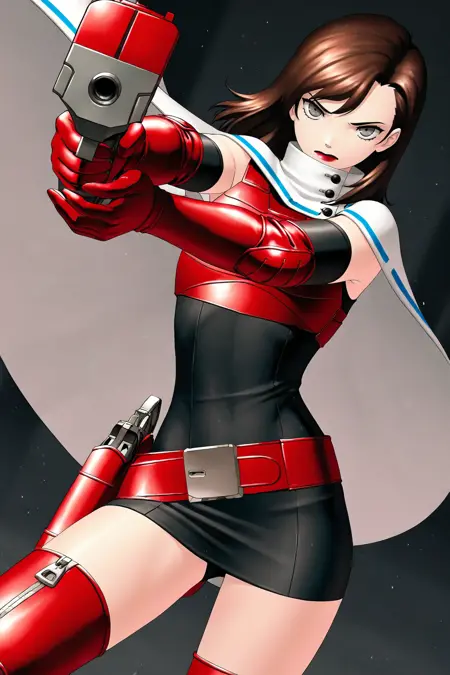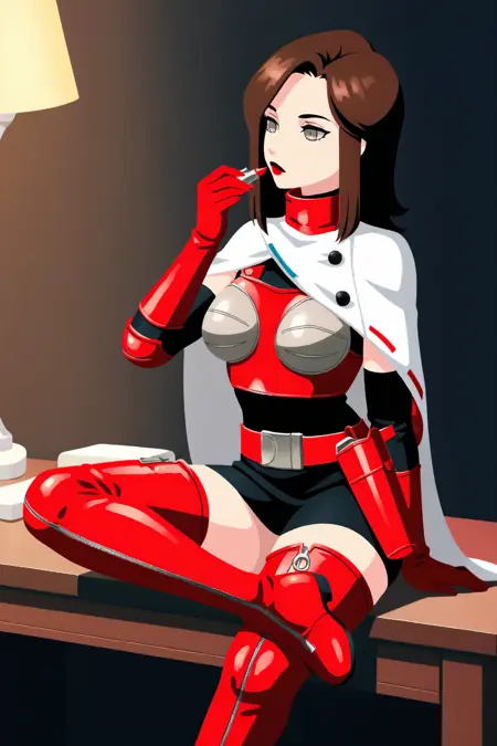 | トレーニングワード | 1girl, medium hair, long hair, straight hair, brown hair, grey eyes, red lipstick, red neck armor, (white short cape, blue tape trim, buttons), (red breastplate, ((grey breast pads))), black camisole dress, short black sleeves, elbow gloves, grey elbow pads, red belt, holster, (red thigh boots, zipper), grey kneepadsコピーしました! |