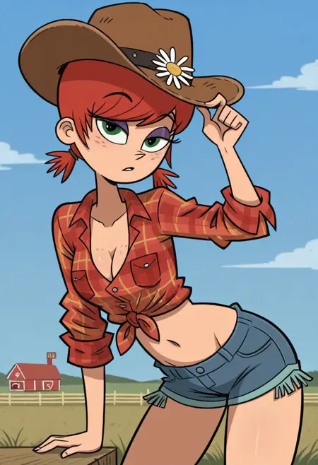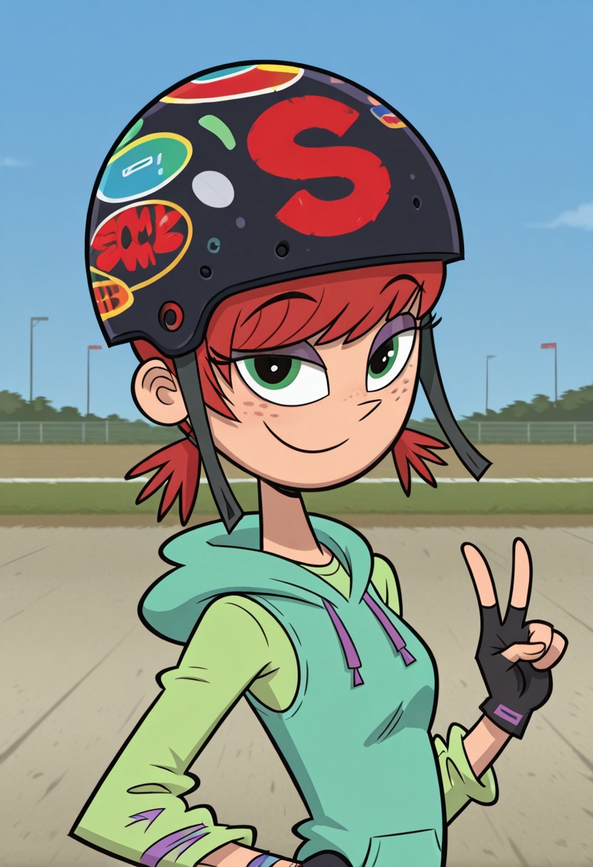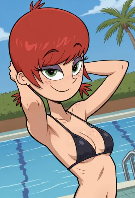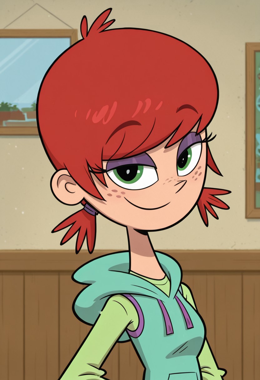 1girl, solo, Scarlett_KB, 薄い肌, そばかす, 緑の目, 濃いラベンダー色のアイシャドウ, 赤髪, 短い髪, 前髪, 小さな低めの二つのポニーテール