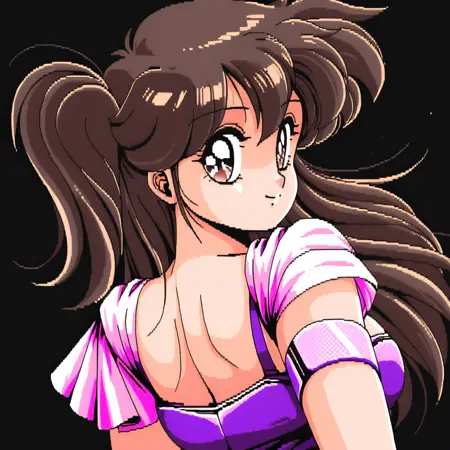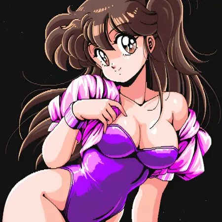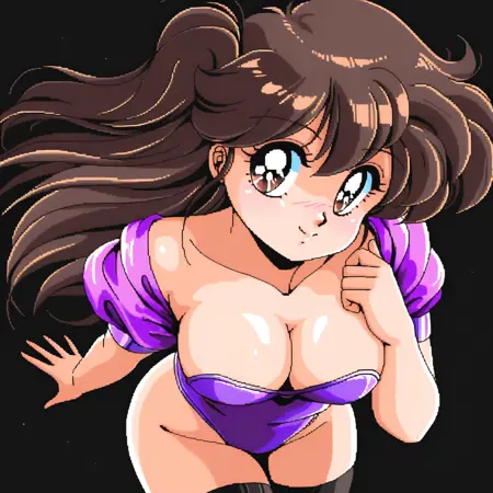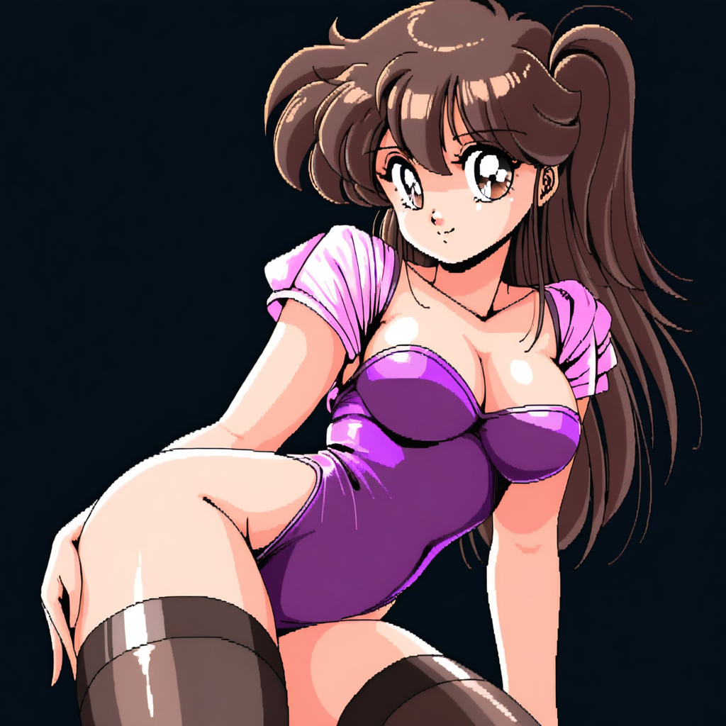 노출, 가슴, 누워 있음, 레트로 아트스타일, 한쪽 눈 위의 머리카락, 음부, 옆으로 누움, 중간 크기 가슴, 트윈테일, 1980년대 (스타일), 시청자 바라보기, 엉덩이,