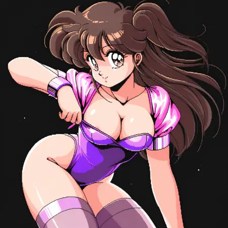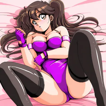 가슴, 장갑, 유두, 손가락 없는 장갑, 중간 크기 가슴, 레오타드, 보라색 레오타드, 립스틱, 벌어진 입, 메이크업,