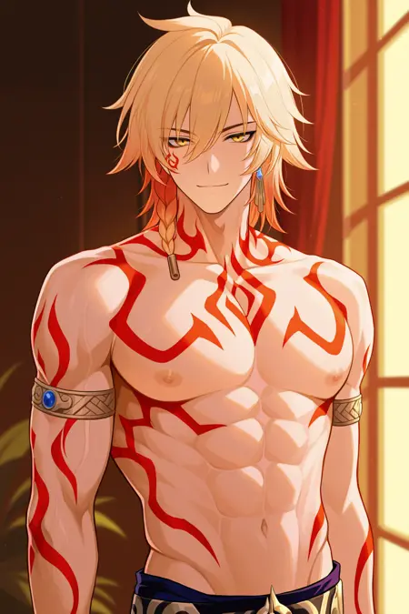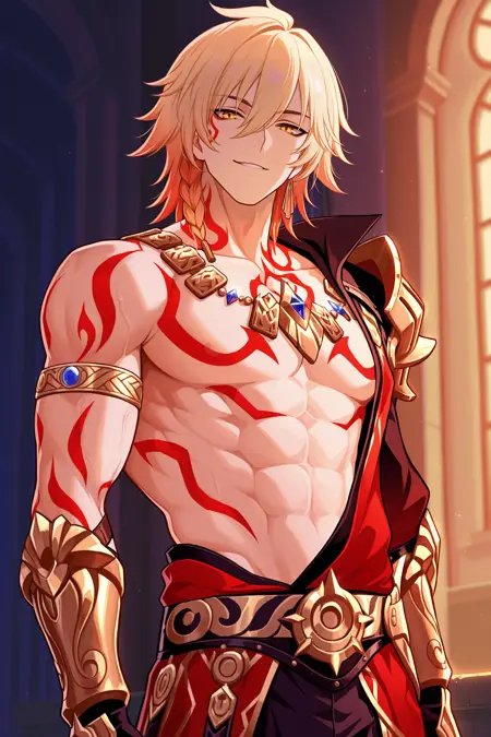mydei, gradient hair, blonde hair, yellow eyes, golden armor, tattoo