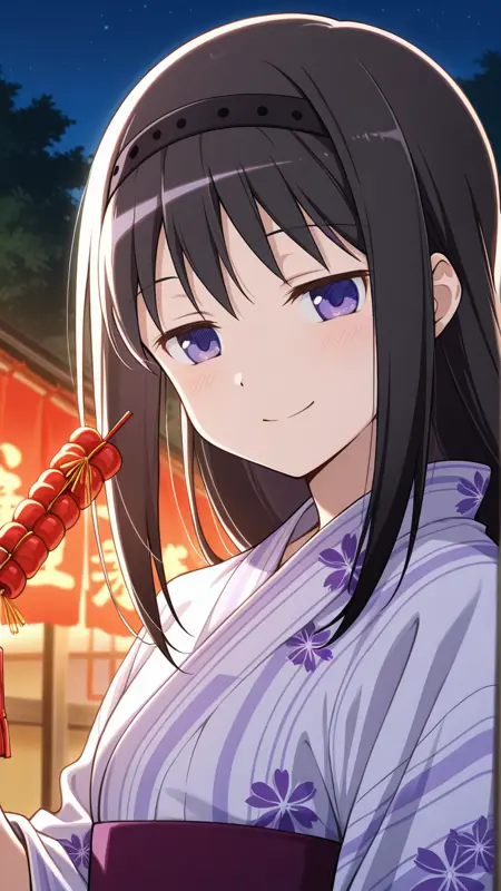akemi homura, black hair, long hair, purple eyes, hairband, red hairband, sidelocks,