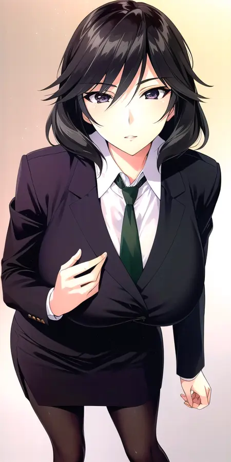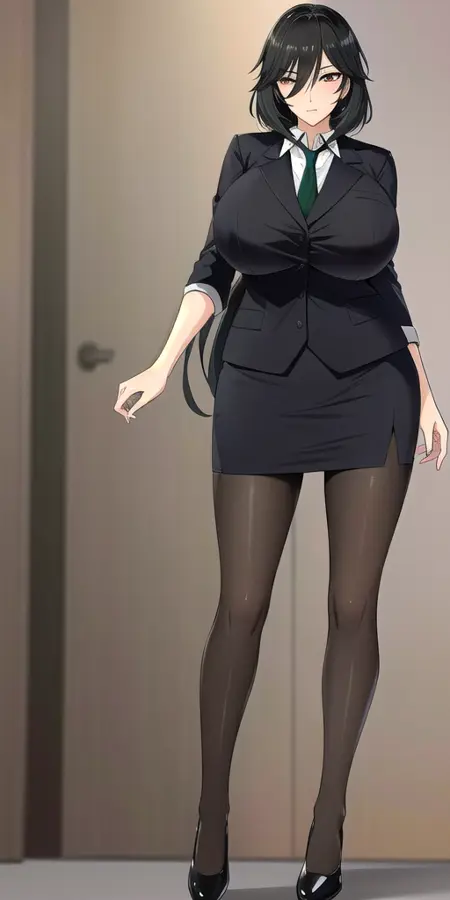 - Black_skirt_suit_Black_pantyhose_Green_necktie:彼女の標準的な衣装。