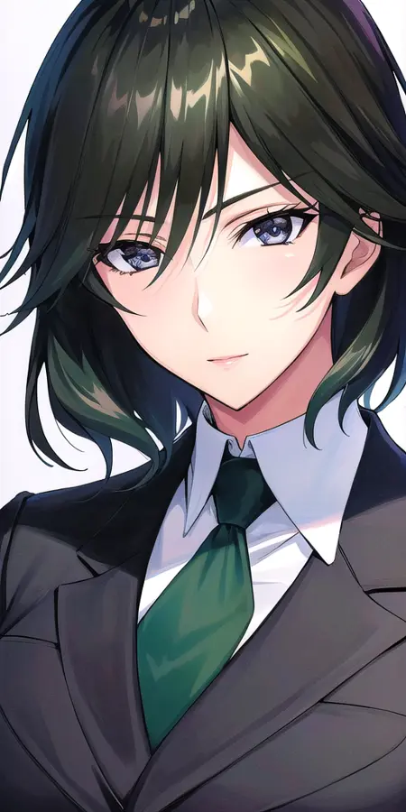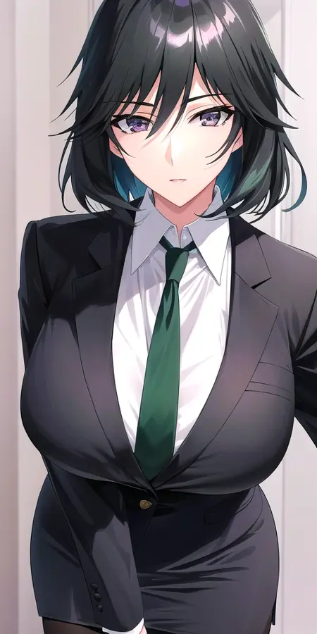 - Black_skirt_suit_Black_pantyhose_Green_necktie: 그녀의 표준 복장입니다.