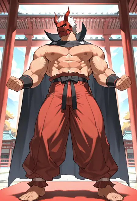 프롬프트:grant, 빨간 바지, 검은 망토, 흰 머리, 뿔 모양 마스크, 맨발