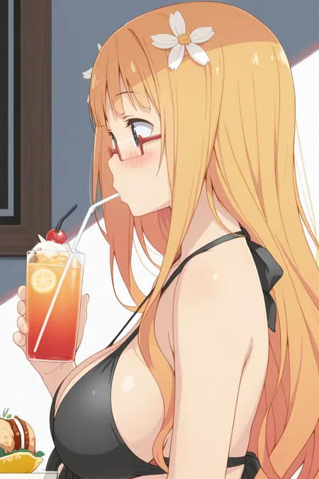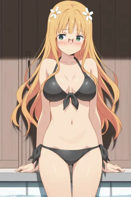 mitsuki, 1girl, glasses, long hair, hair ornament, solo, blonde hair, green eyes, black bikini, cleavage, front-tie top, side-tie bikini bottom