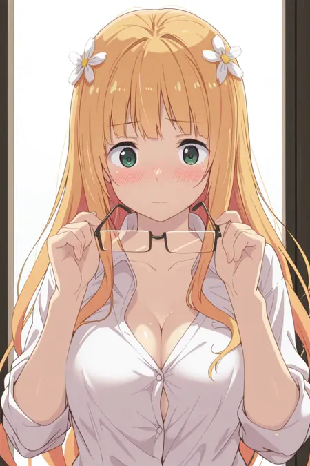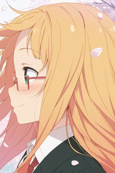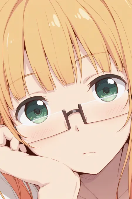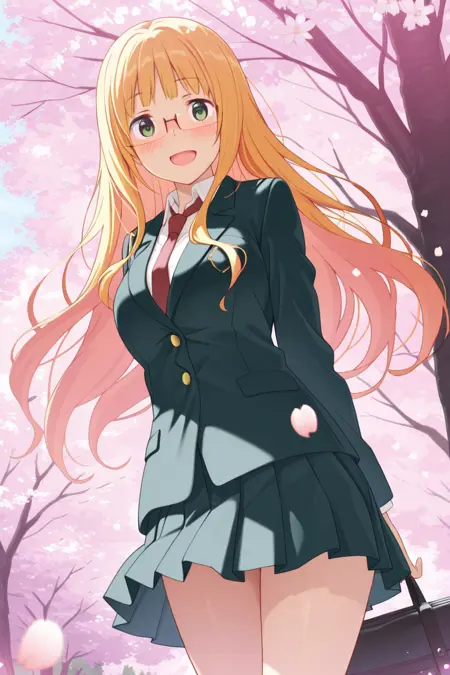 mitsuki, 1girl, glasses, long hair, hair ornament, solo, blonde hair, green eyes, necktie, school uniform, blazer/shirt