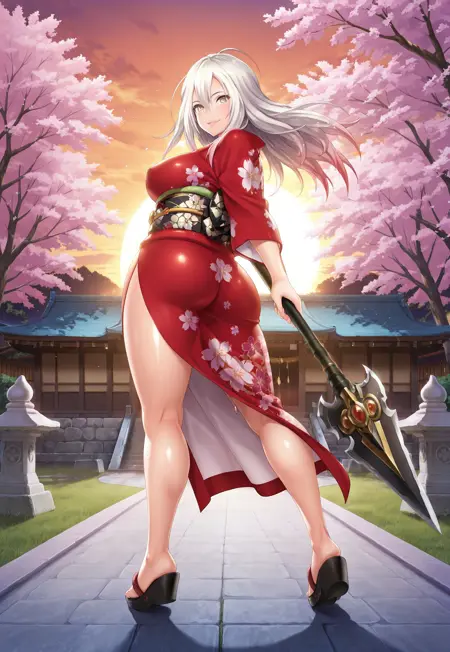 タグ:真田ホウマ、長い髪、白髪、グラデーション髪、V字前髪、額に髪がかかる、金色の目、唇、大きな胸、くびれ、広い hips、輝く肌、