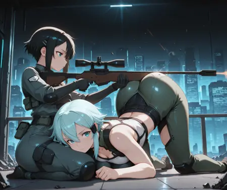 此 LoRA 生成包含两个人的姿势:一人持步枪/狙击枪瞄准,另一人作为人体三脚架支撑射手。