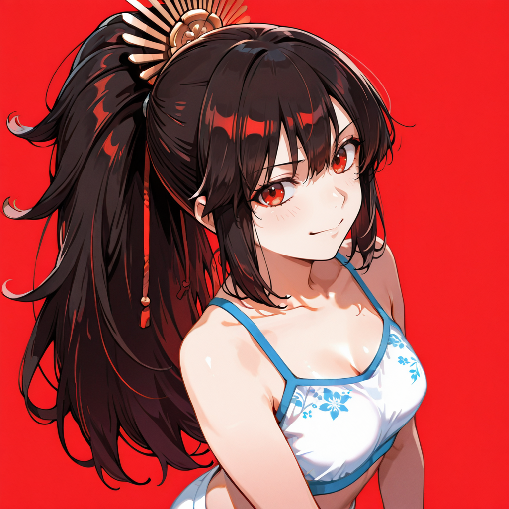 트리거: OdaKippoushi, oda nobunaga (fate), oda uri, 민소매, 토스 Hairstyle, 손가락 없는 장갑, 모자, 검은 머리, 붉은 눈, 한쪽 소매, 검은 장갑, 비대칭 옷, 1girl, oda nobunaga (koha-ace), 뾰족한 모자, 가문 문장, 앞머리, 붉은 바지, 크롭탑, 옆머리, 검은 머리 장식, 벨트, 어깨 노출, 셔츠, 가슴, 비대칭 장갑, 카우보이 샷