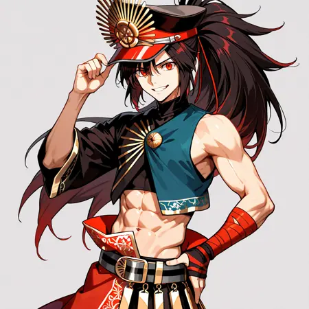 남성 외형 트리거: OdaKippoushi, 붉은 눈, 한쪽 소매, 검은 머리, 모자, oda nobunaga (fate), 긴 머리, 토스 Hairstyle, oda uri, 복근, 뾰족한 모자, 크롭탑, 근육질 남성, 가문 문장, 카우보이 샷