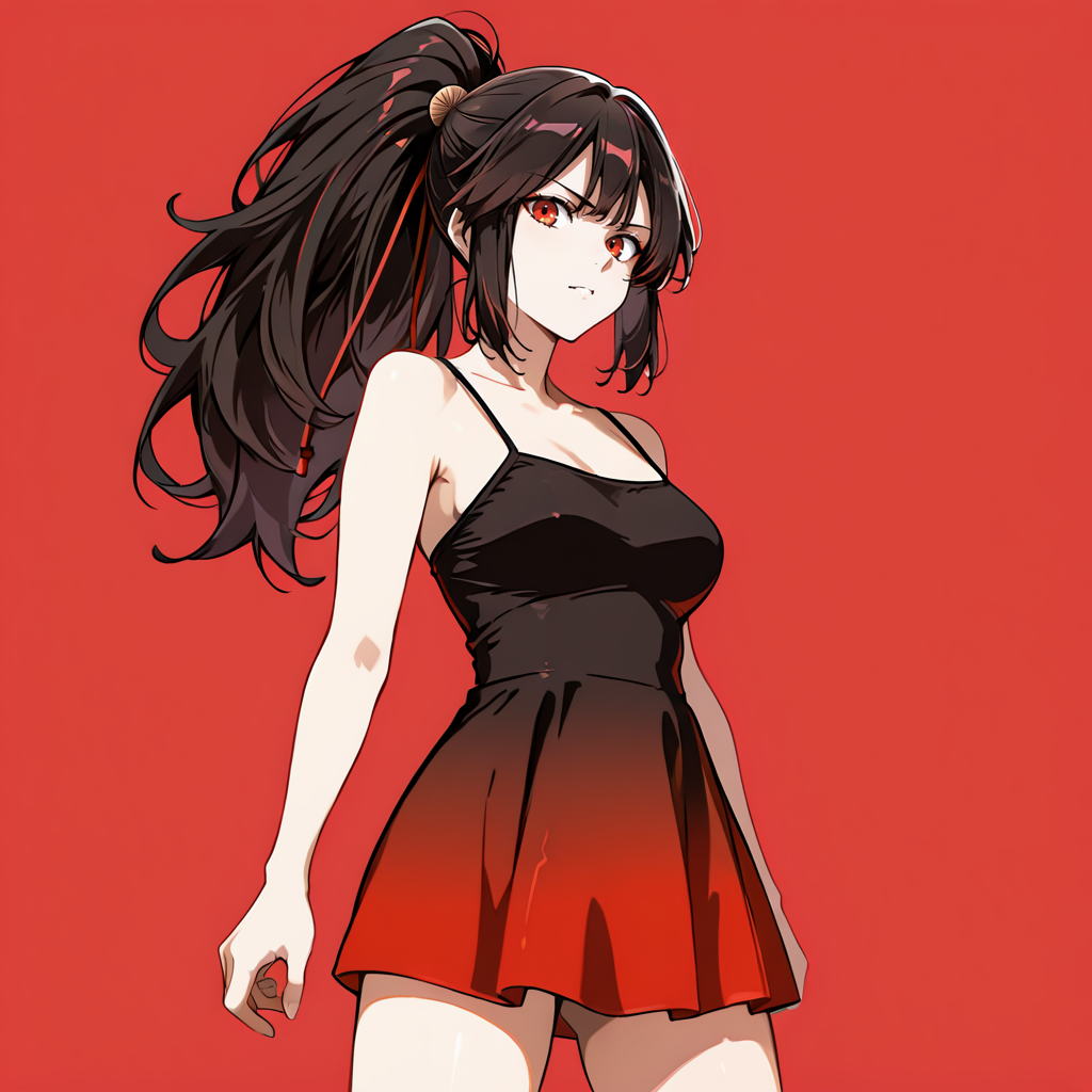 캐주얼 외형 트리거: OdaKippoushiCasual, 빨간 셔츠, 붉은 눈, 손을 주머니에 넣음, 토스 Hairstyle, 검은 바지, 열린 옷, 긴 머리, 흰 셔츠, 검은 머리, 열린 셔츠, 머리 리본, 팔찌, 빨간 리본, 칼라 셔츠, 짧은 소매, 앞머리, 1girl, 카우보이 샷