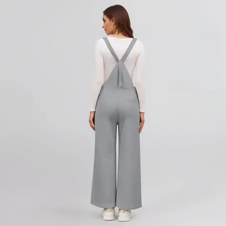 メロキーティーの女性用カジュアルノースリーブジャンパースーツ、タイストラップ仕様のテクスチャードロンパース、ポケット付きワイドレッグオーバーオールを特徴とする女性用服の画像を作成します。これらは女性向けのグレー色のフォーマルオーバーオールです。このワイドレッグパンツは、AIモデルにオーバーオールを着せたい方々にとって理想的な選択肢となります。