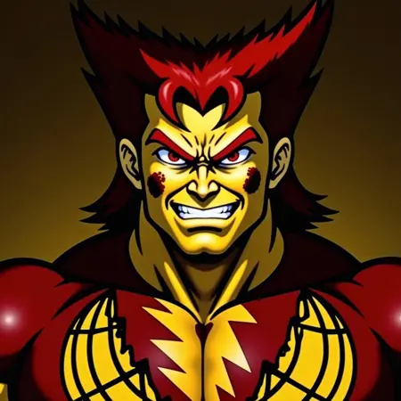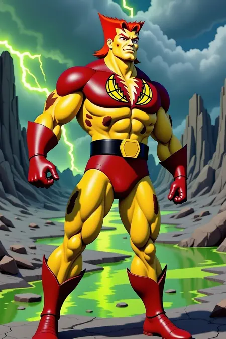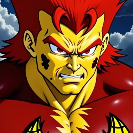 肯定的タグ:captpollution, cpollu, captpollu, muscular male, villain, yellow character, yellow skin, vibrant yellow skin, yellow face, vibrant yellow face, brown mud spots on face, brown mud spots on skin, brown spots on skin, mud on skin, red spiky hair, vibrant red hair, vibrant red spiky hair, red eyebrows, red pupils, cracked yellow emblem, yellow emblem on chest, short red shorts, black belt, yellow belt buckle, red boots