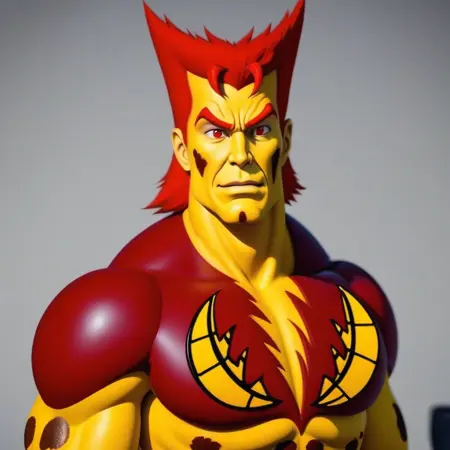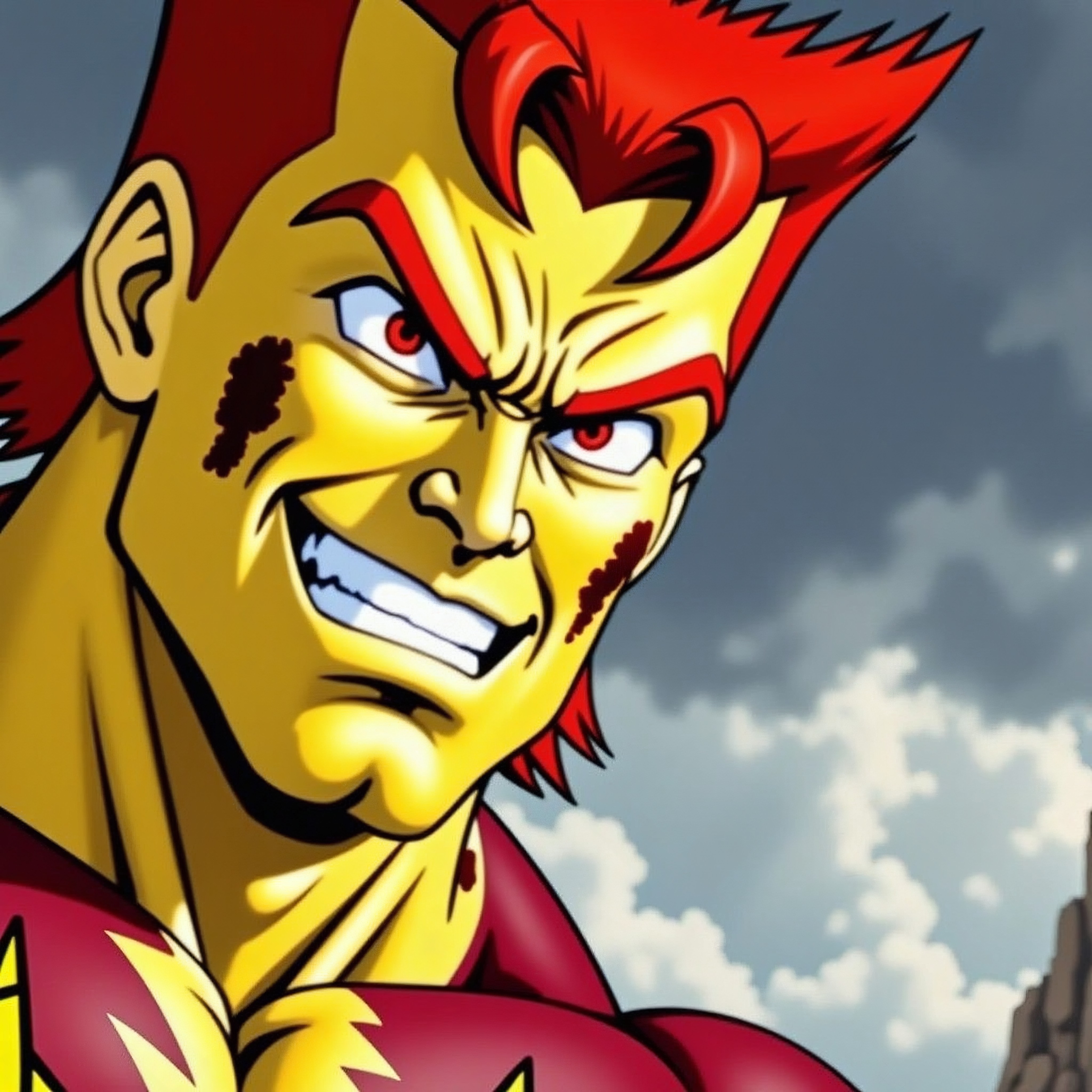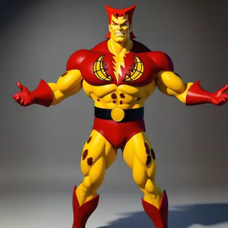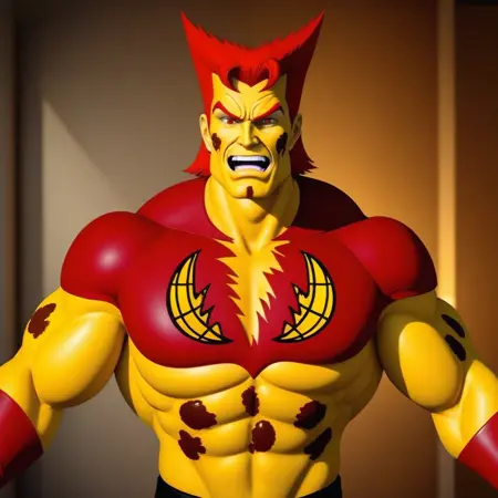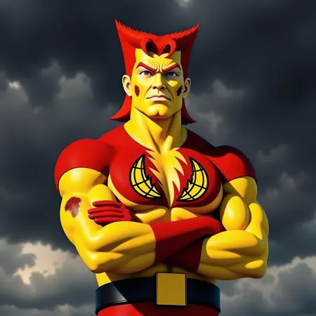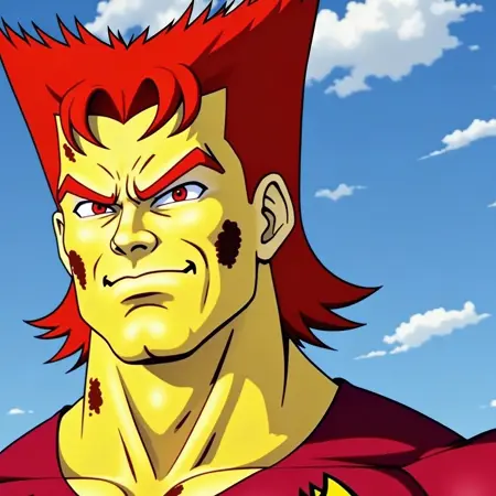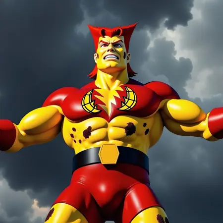 captpollution, cpollu, captpollu, muscular male, villain, yellow character, yellow skin, vibrant yellow skin, yellow face, vibrant yellow face, brown mud spots on face, brown mud spots on skin, brown spots on skin, mud on skin, red spiky hair, vibrant red hair, vibrant red spiky hair, red eyebrows, red pupils, cracked yellow emblem, yellow emblem on chest, short red shorts, black belt, yellow belt buckle, red boots
