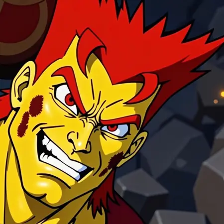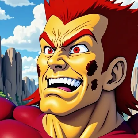 • 头发:尖刺状、鲜艳的红色头发,向上竖起,呈现出锐利而具有攻击性的外观。