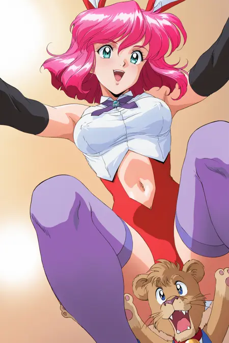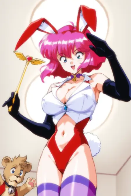 主要触发词:迷雾五月、粉发、短发、蓝眼、大胸、乳头遮盖、无袖翻领上衣、红色紧身衣、露脐设计、黑色肘套、动物耳朵、兔子尾巴、紫色过膝袜、魔法棒、复古画风、1990年代风格