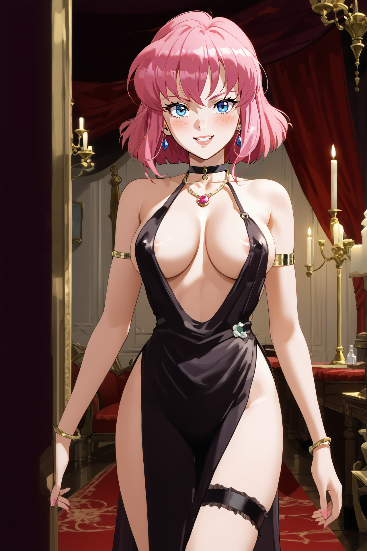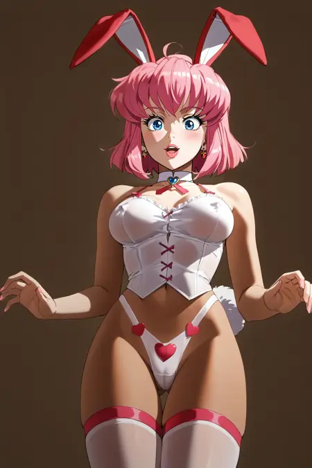 主要なトリガー:ミスティ・メイ、ピンクの髪、短髪、青い目、大きな胸、乳首カバー、ノースリーブのシャツ、赤いレオタード、おへそカットアウト、黒い肘までグローブ、動物の耳、ウサギの尾、紫の太ももハイソックス、魔杖、レトロなアートスタイル、1990年代(スタイル)