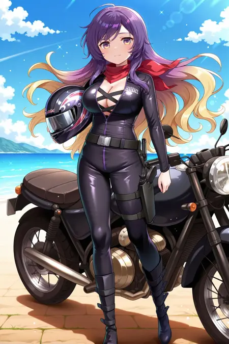 hijiri byakuren, 1girl, solo, yellow eyes, purple hair, long hair, multicolored hair, gradient hair, breasts, hijiri byakuren \(rabbit-eared biker\), turbo byakuren, 红色头巾,机车服饰,机车服,黑色连体衣,拉链,部分拉开,胸部显露,交叉系带服饰,黑色腰带,大腿绑带,黑色头盔,长袖,摩托车头盔,黑色长靴,