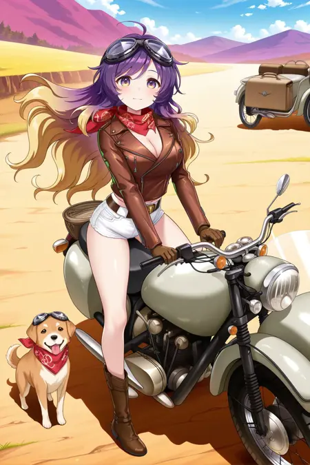 hijiri byakuren, 1girl, solo, gradient eyes, purple eyes, gradient hair, purple hair, brown hair, long hair, hijiri byakuren \(wheel of dharma diva\), 替代服装,呆毛,头戴护目镜,红色头巾,胸部显露,棕色夹克,皮夹克,长袖,棕色手套,棕色腰带,白色短裤,超短裤,棕色长靴,灰色摩托车,边车,狗,