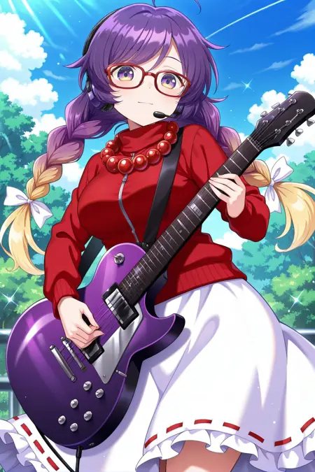 hijiri byakuren, 1girl, solo, gradient eyes, purple eyes, gradient hair, purple hair, brown hair, long hair, 呆毛,双辫,hijiri byakuren \(singing vairocana prayers\), 替代服装,发型变更,发带,白色发带,红色边框眼镜,耳机,珠串项链,红色珠子,高领,红色毛衣,长袖,拉链,白色短裙,荷叶边短裙,丝带装饰短裙,手持吉他,Gibson Les Paul,