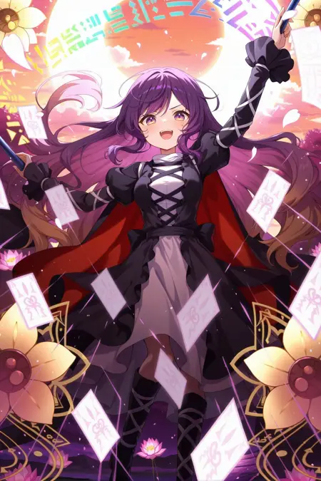 hijiri byakuren, 1girl, solo, yellow eyes, purple hair, long hair, multicolored hair, gradient hair, breasts, 分层长裙,白色长裙,黑色长裙,交叉系带服饰,长袖,蓬松袖子,黑色斗篷,黑色鞋履,