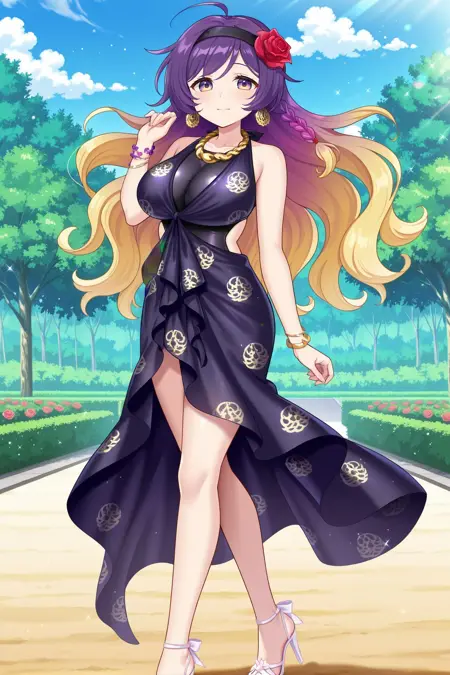 hijiri byakuren, 1girl, solo, yellow eyes, purple hair, long hair, multicolored hair, gradient hair, breasts, hijiri byakuren \(yao bikuni unleashed\), 呆毛,单辫,发饰花,发饰,黑色发带,黑色长裙,连体泳装,一体式泳装,花卉图案,手链,高跟鞋,珠宝,项链,力量拳,