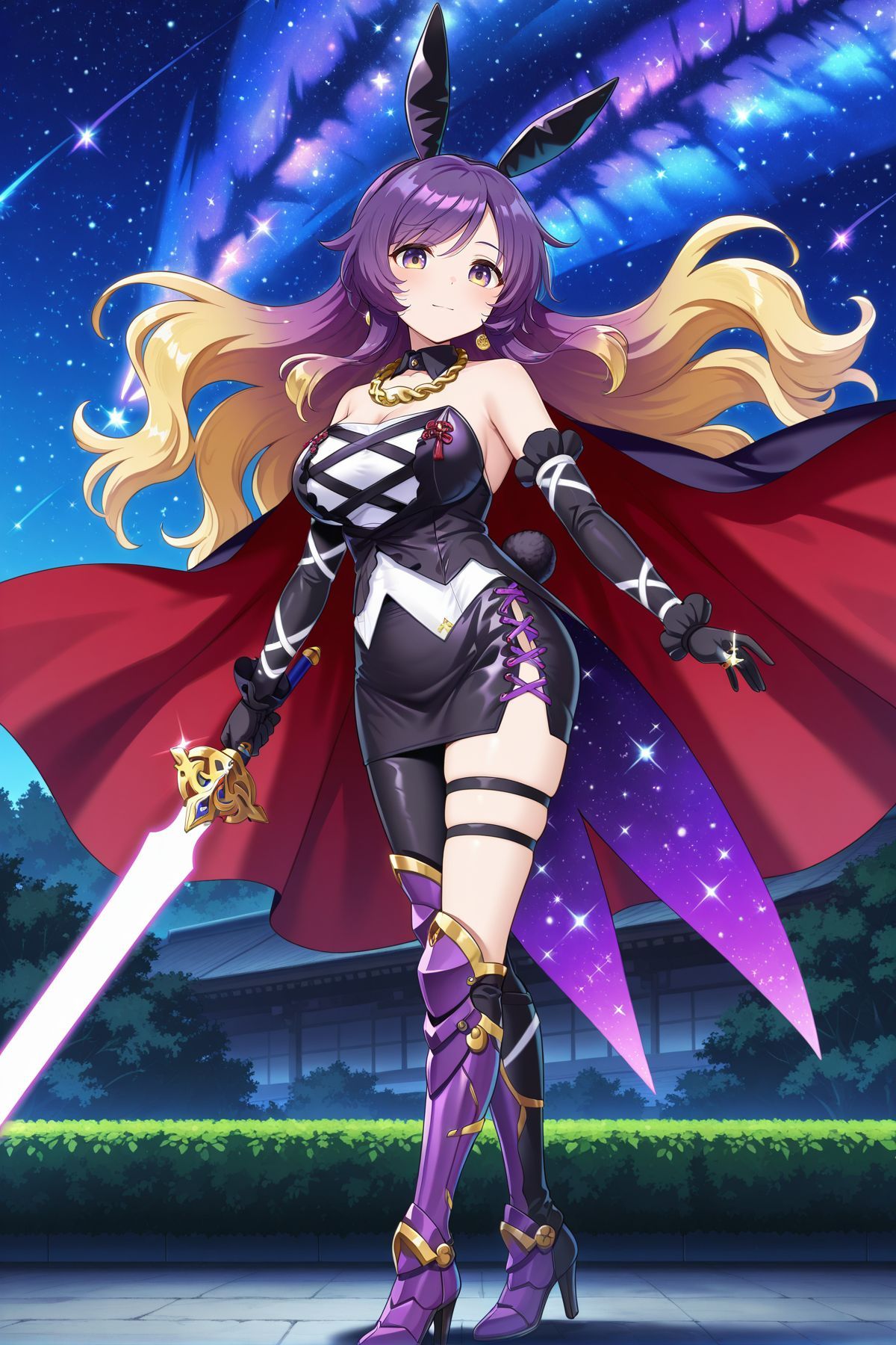 hijiri byakuren, 1girl, solo, gradient eyes, purple eyes, gradient hair, purple hair, brown hair, long hair, 侧发绺,波浪发,假兔耳,黑色兔耳,黑色兔尾,hijiri byakuren \(star sword easter bunny\), 替代服装,双面斗篷,黑色斗篷,紫色斗篷,可拆卸衣领,圆环项链,非传统兔女郎,白色紧身衣,黑色连体衣,交叉系带服饰,露肩,黑色手套,肘部手套,黑色短裙,铅笔裙,不对称腿部服饰,不匹配腿部服饰,大腿绑带,大腿靴,高跟靴,黑色长靴,紫色长靴,手持剑,能量剑,发光剑,