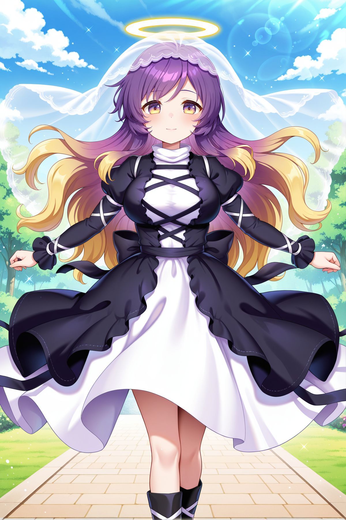 hijiri byakuren, 1girl, solo, gradient eyes, purple eyes, gradient hair, purple hair, brown hair, long hair, hijiri byakuren, 1girl, solo, gradient eyes, purple eyes, gradient hair, purple hair, brown hair, long hair, 侧发绺,黄色光环,hijiri byakuren \(holy again\), 改编服装,新娘面纱,透明面纱,分层长裙,黑色长裙,白色长裙,交叉系带服饰,中心荷叶边,蓬松长袖,朱丽叶袖,背部蝴蝶结,黑色蝴蝶结,黑色长靴,