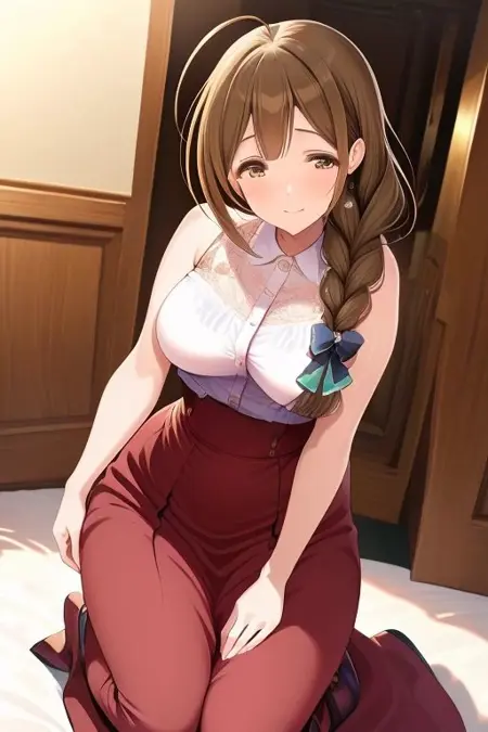 トリガー単語: chiyuki_a, バレッタ, 茶色の髪, 片側の編み込み, スカート, 長い髪, 茶色の目, 長いスカート, ウエスト高めのスカート, 赤いスカート, 袖なし, 肩出し, ポロシャツ, 無地の赤いスカート,