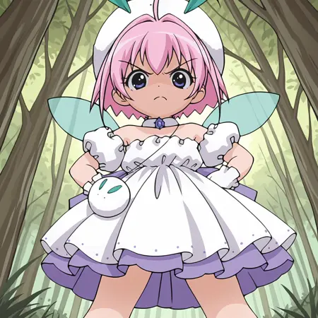 suilf, 1girl, 핑크 헤어, 단발, 아호게, 파란 눈, 모자, 드레스, 장갑, 날개, 치커, 부츠,