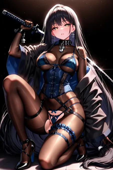 中程度の胸、青いブラ、青いコルセット、オープンジャケット、黒いジャケット、片肩出し、ボディーストッキング、服の下に着たボディスーツ、茶色のボディスーツ、股間が開いたボディスーツ、股部分の切り取り、複数の太ももストラップ、太ももストラップ、太ももスクランチ、青いパンツ、