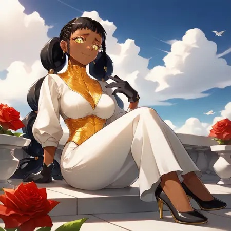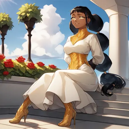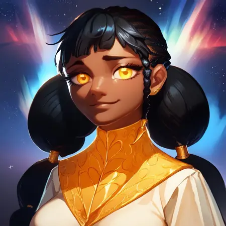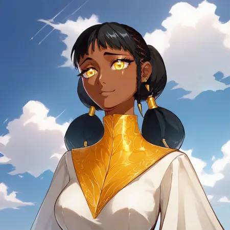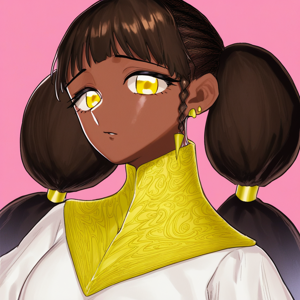 暗い肌、茶色の肌、黄色い目、黒髪、結んだ髪、編み髪、太い編み髪、丸く結んだ髪、丸く結んだ編み髪、非対称な前髪、編み髪の前髪、ゴールドのイヤリング
