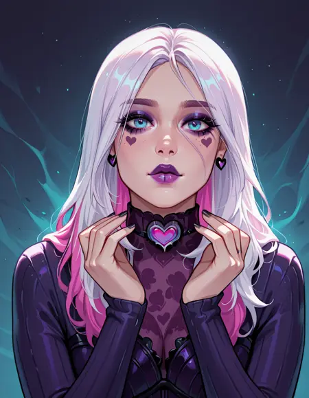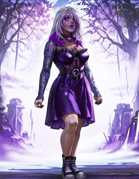 1girl, solo, multicolored hair, white hair, long hair, purple eyes, skirt, makeup, hair over one eye, purple hair, dress, standing, purple lips, breasts, see-through, jewelry, sable ward