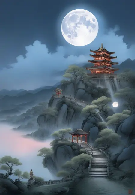 李暁明先生の作品は、霧のようにぼんやりした、仙界のようなビジュアルが特徴であり、建築や天庭などの環境と組み合わせることで、非常に仙的な画風を生み出します。