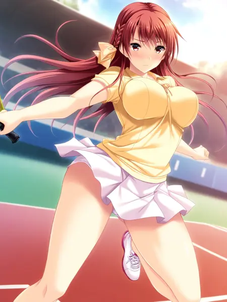 网球制服,百褶裙,白色短裙,迷你裙,短袖,黄色上衣,白色运动鞋,