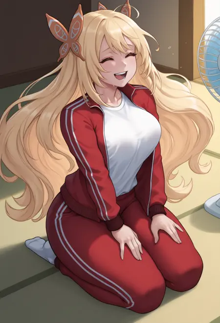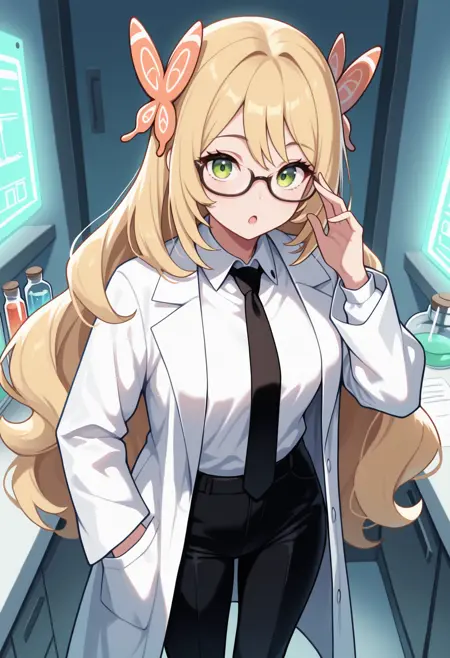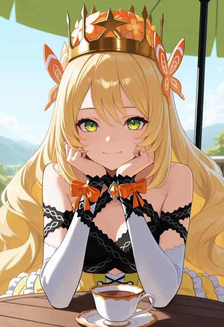 触发词 + 外观: cel1ne, 金发, 蝴蝶发饰, 绿色眼睛