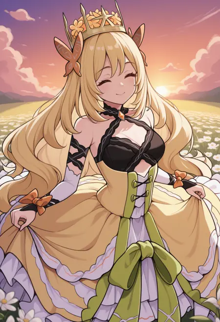 默认服装: 头发花朵, 王冠, 黄色连衣裙, 荷叶边连衣裙, 交叉系带连衣裙, 交叉式吊带上衣, 胸针, 橙色宝石, 连衣裙蝴蝶结, 绿色蝴蝶结, 可拆卸袖子, 手腕蝴蝶结, 橙色蝴蝶结, 露肩