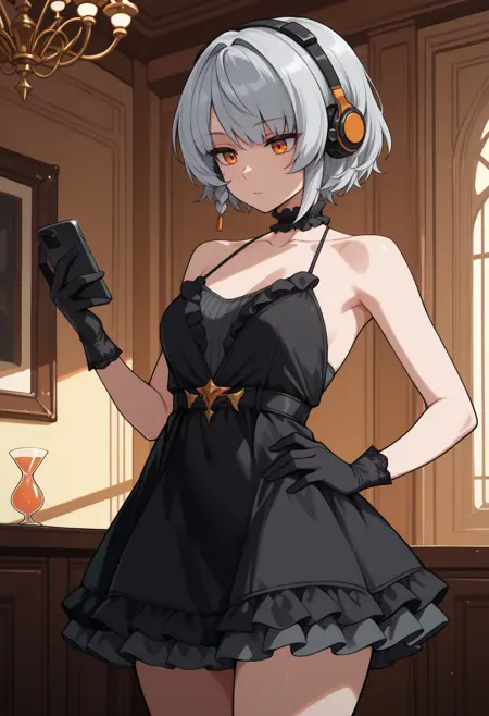シルバーソルジャー: abdmrslvr, 短い髪, 灰色の髪, 片側だけ上げたスタイル, 二つの編み髪, オレンジ色の目, 短いドレス, 二色柄のドレス, 白のドレス, 黒のドレス, プリーツドレス, 衣服のカットアウト, ボタン, 短い袖, 白の手袋, フィンガーレス手袋, 灰色のスラックス, 脚のアーマー