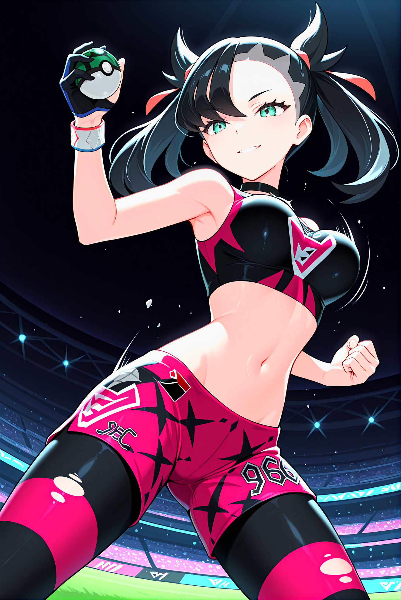 アリーナ衣装:片手の手袋、破れた服、黒のチョーカー、レギンス、ダイナマックスバンド、ショートトップ、ショーツ