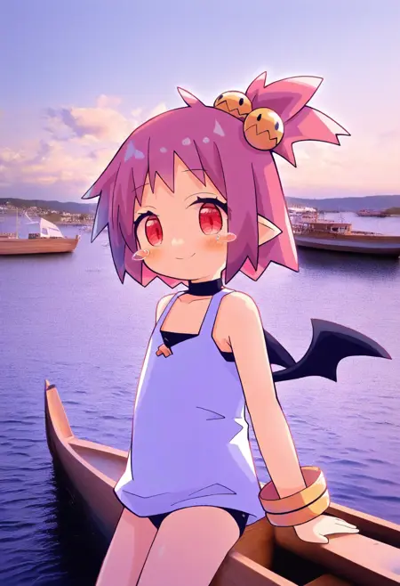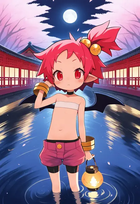 Triggers: 1girl, hanako \(disgaea\), red eyes, pink hair, short hair, wings, hair ornament, jewelry