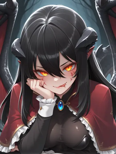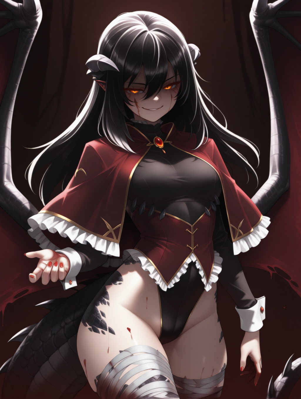 BlooDragon, 검은 머리, 긴 머리, 눈 사이의 머리, 주황색 눈, 빛나는 눈, 얼굴 무늬, 몬스터 걸, 드래곤 날개, 드래곤 꼬리, 갈고리발톱, 뿔, 붕대 감긴 다리, 빨간 손톱, 붕대, 긴 소매, 검은 레오타드, 프릴, 브로치, 보석, 네일 폴리시, 캐프레트, 검은 소매, 흰색 팔목