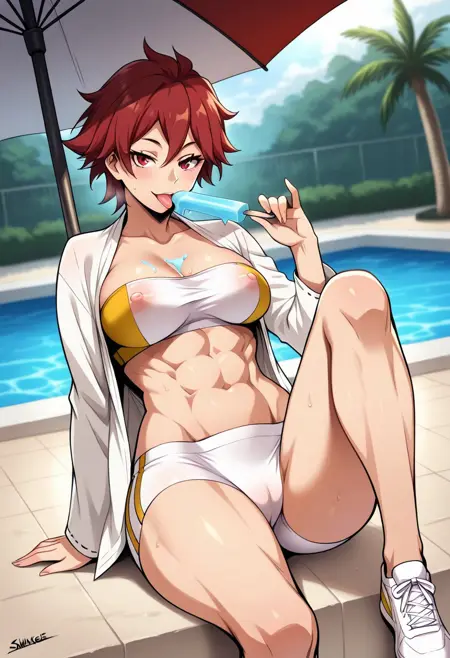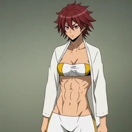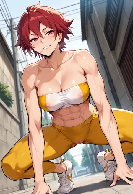 MikageSharakuDRRR, 1girl, solo, muscular female, tomboy, short hair, red hair, bangs, red eyes, hair between eyes, lips, collarbone, large breast, cleavage, strapless, sports bra, white and yellow tube top, navel, midriff, groin, abs, obliques, biceps, thick thighs, white and yellow gym shorts, shoes, white light jacket,
