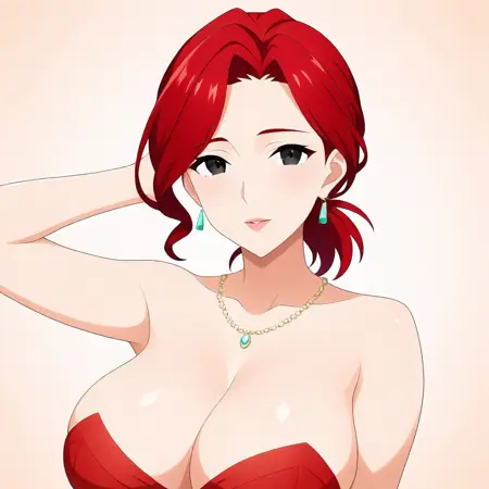 Dara_Test, red hair, milf, short hair, wavy ponytail, black eyes